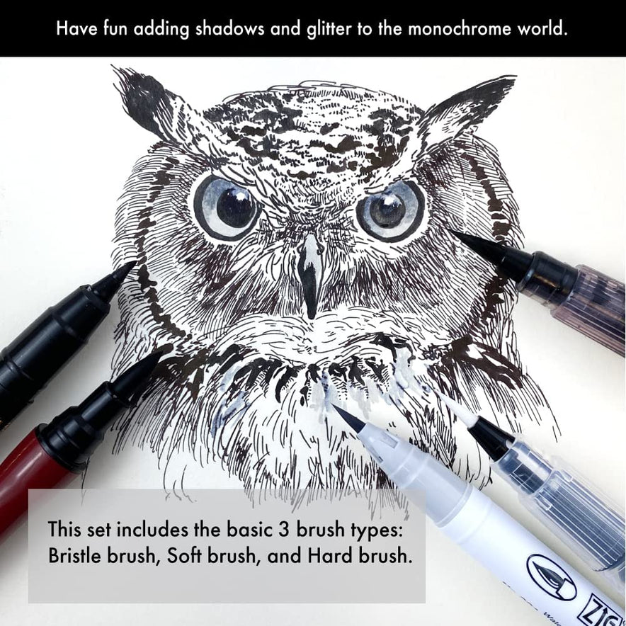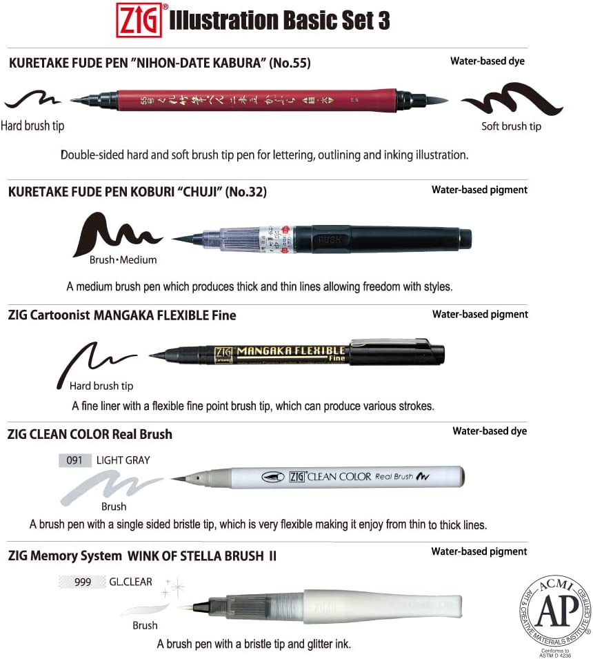 ZIG CLEAN COLOR Real Brush is a brush-type watercolor pen, so it can be used in a wide range of applications such as illustration, design, lettering, and Manga. Because it is a water-based dye ink, you can blur it with water or mix it with other real brush colors or a blender. ZIG WINK OF STELLA Gl. Clear: Unique brush marker with water-based pigment ink that is safe, odorless, and great for papercrafting and stamping. Ink is mixed beautifully with fine glitters so you can easily add shimmers to your various artworks with this great marker from Kuretake.