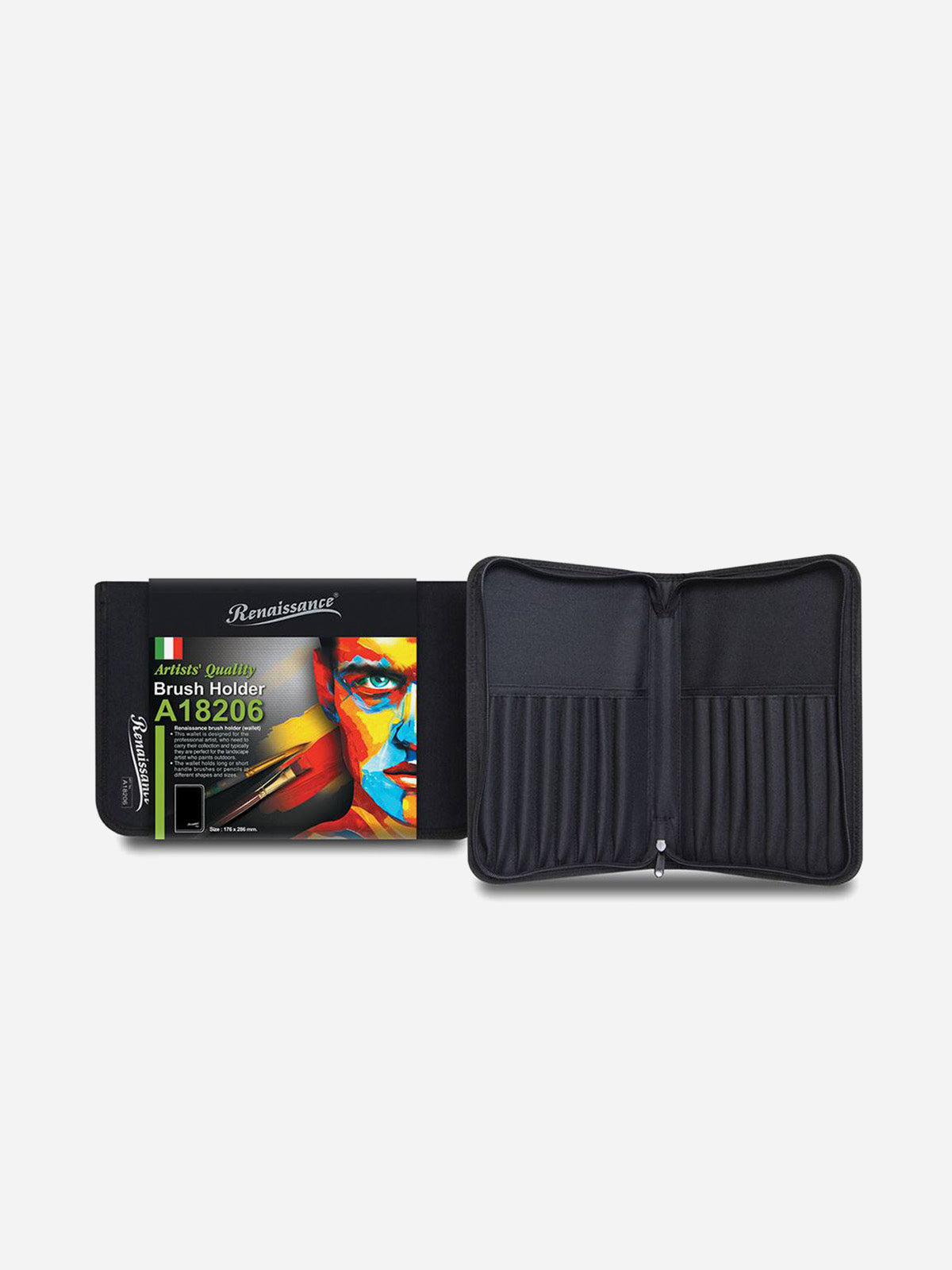 - The brush holder is a premium quality pouch for holding long paintbrushes. It has 16 pockets to store your different variety and brush size.