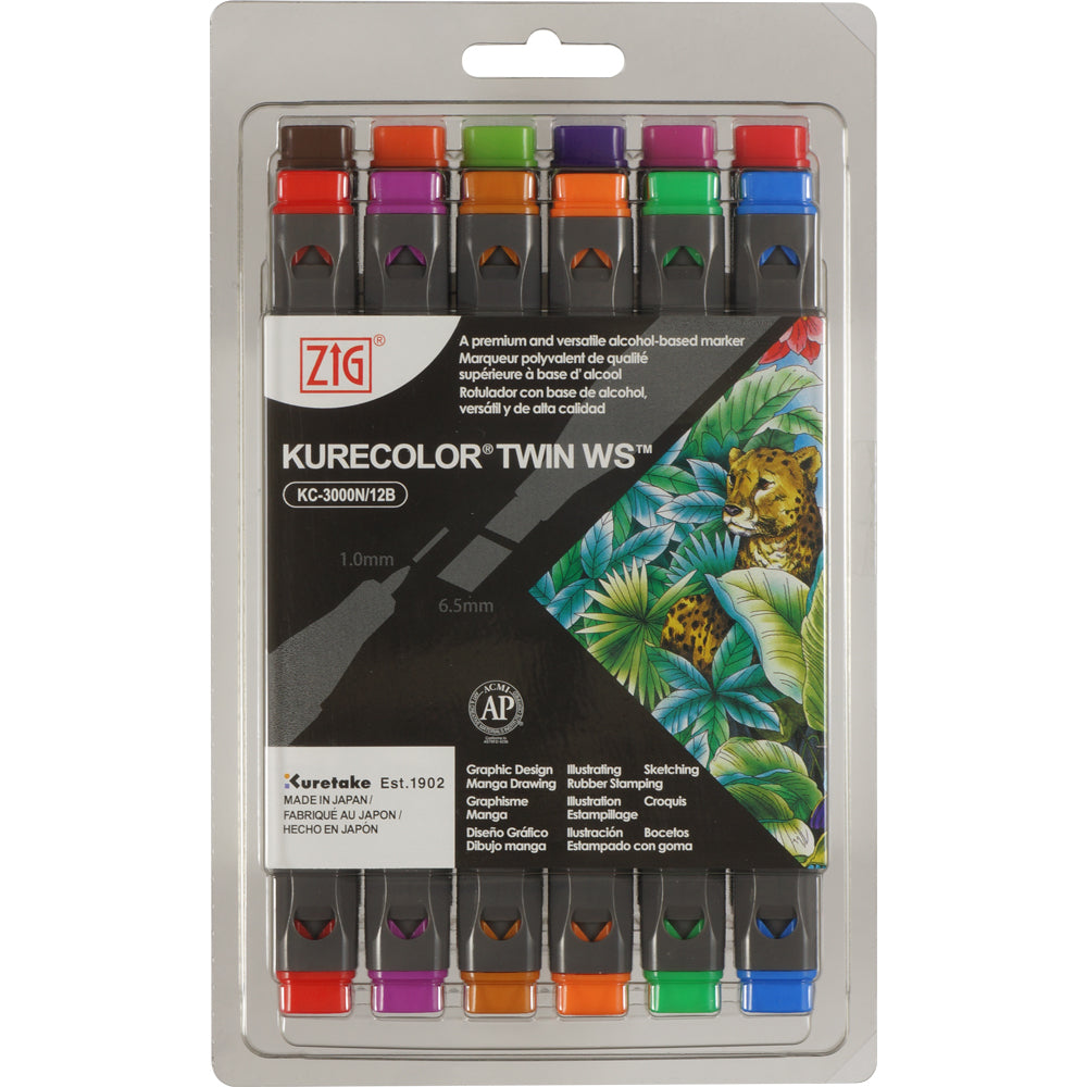 ZIG Kurecolor Twin WS are alcohol-based twin tipped markers equipped with a fine point and broad tip. Xylene free and quick drying, these markers are ideal for fast coloring and detailing.