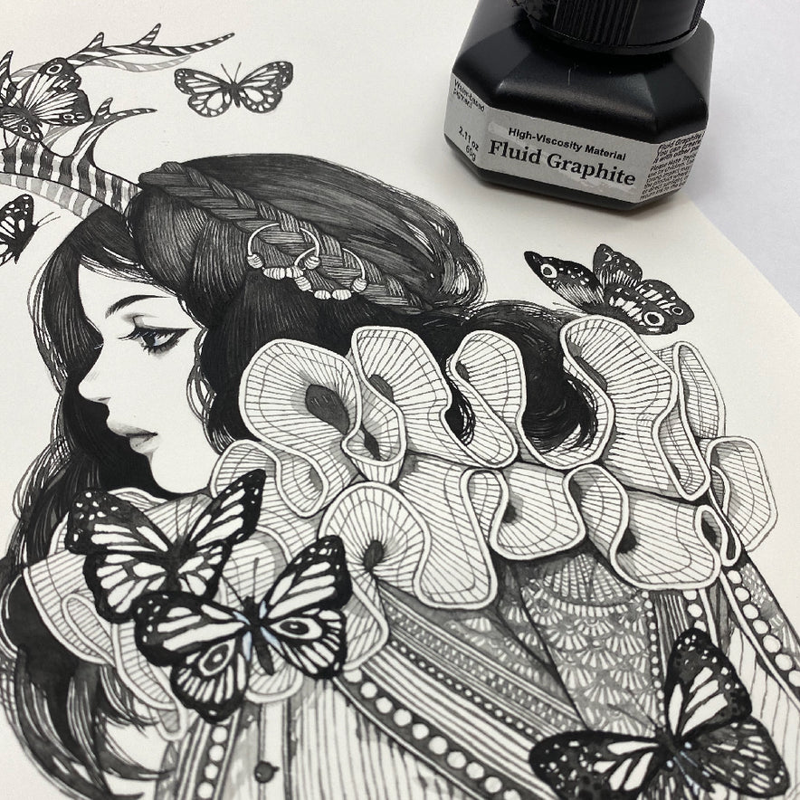 - New item released this year. It is a high-viscosity ink that combines graphite with synthetic resin. Polishing the surface painted with high-viscosity ink gives it a metallic luster.