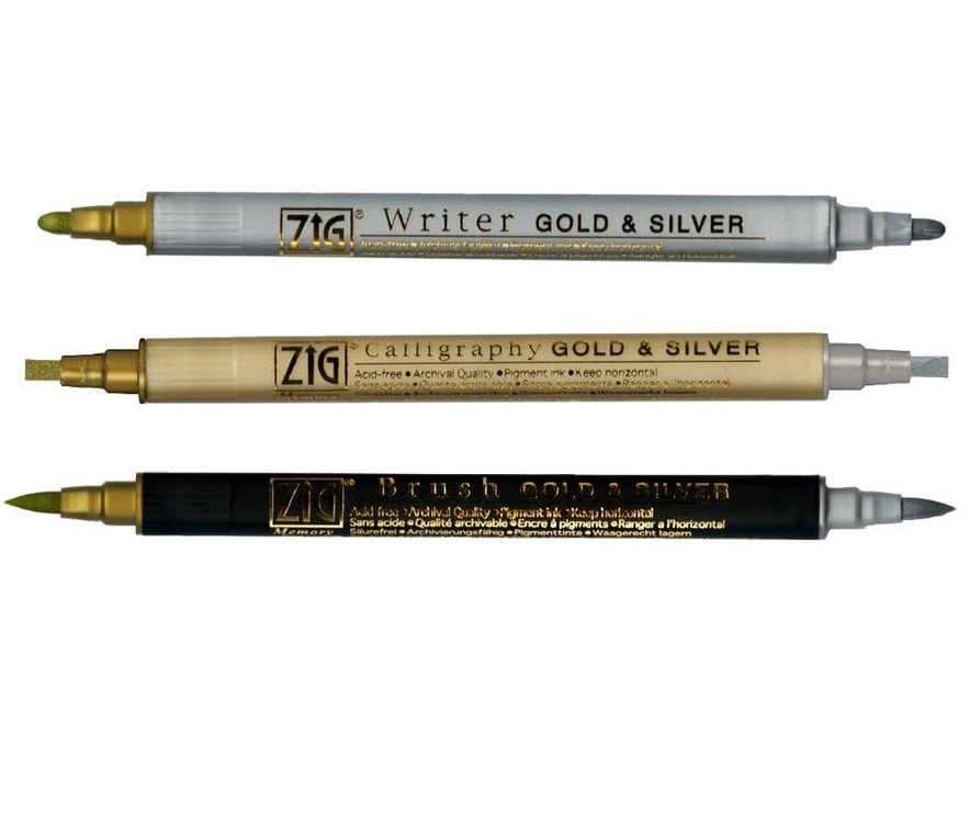 Zig KURETAKE Memory System Gold and Silver Calligraphy Twin Tip Marker Assortment Set of 3 Markers
